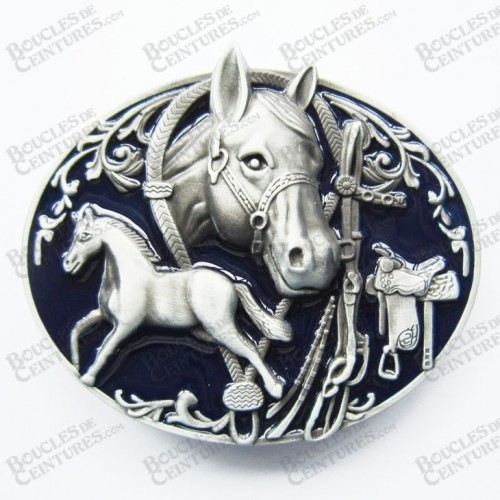BOUCLE DE CEINTURE CHEVAUX EQUITATION SUR FOND ARGENT LUSTRÉ