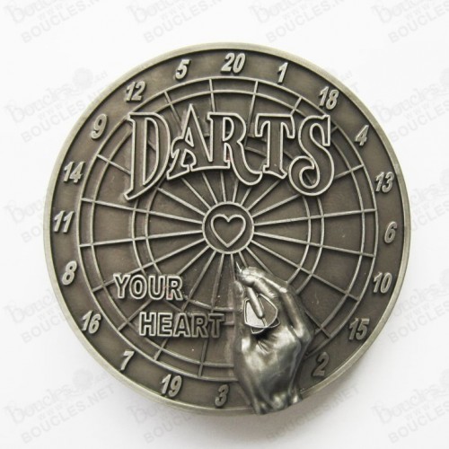 BOUCLE DE CEINTURE JEU DE FLECHETTES - DARTS - FOND ARGENT